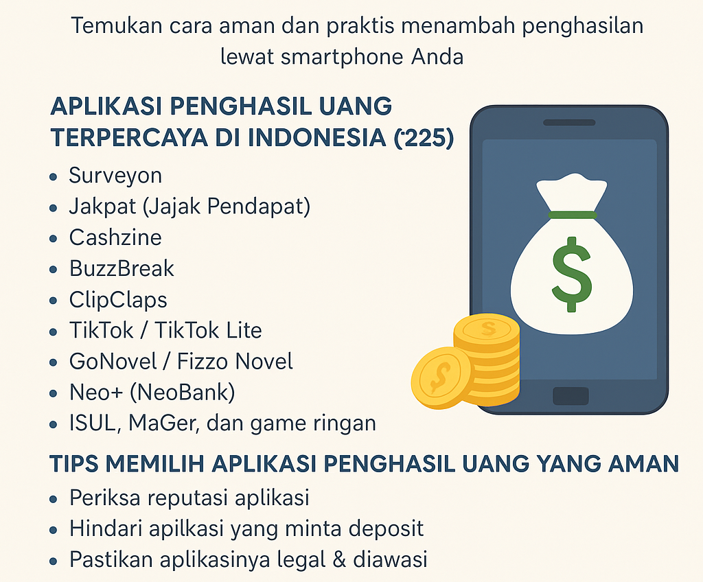 Artikel ini akan membahas secara menyeluruh berbagai aplikasi penghasil uang terpercaya di Indonesia pada tahun 2025, mekanisme cara kerjanya, serta tips penting dalam memilih aplikasi yang aman dan terbukti membayar.